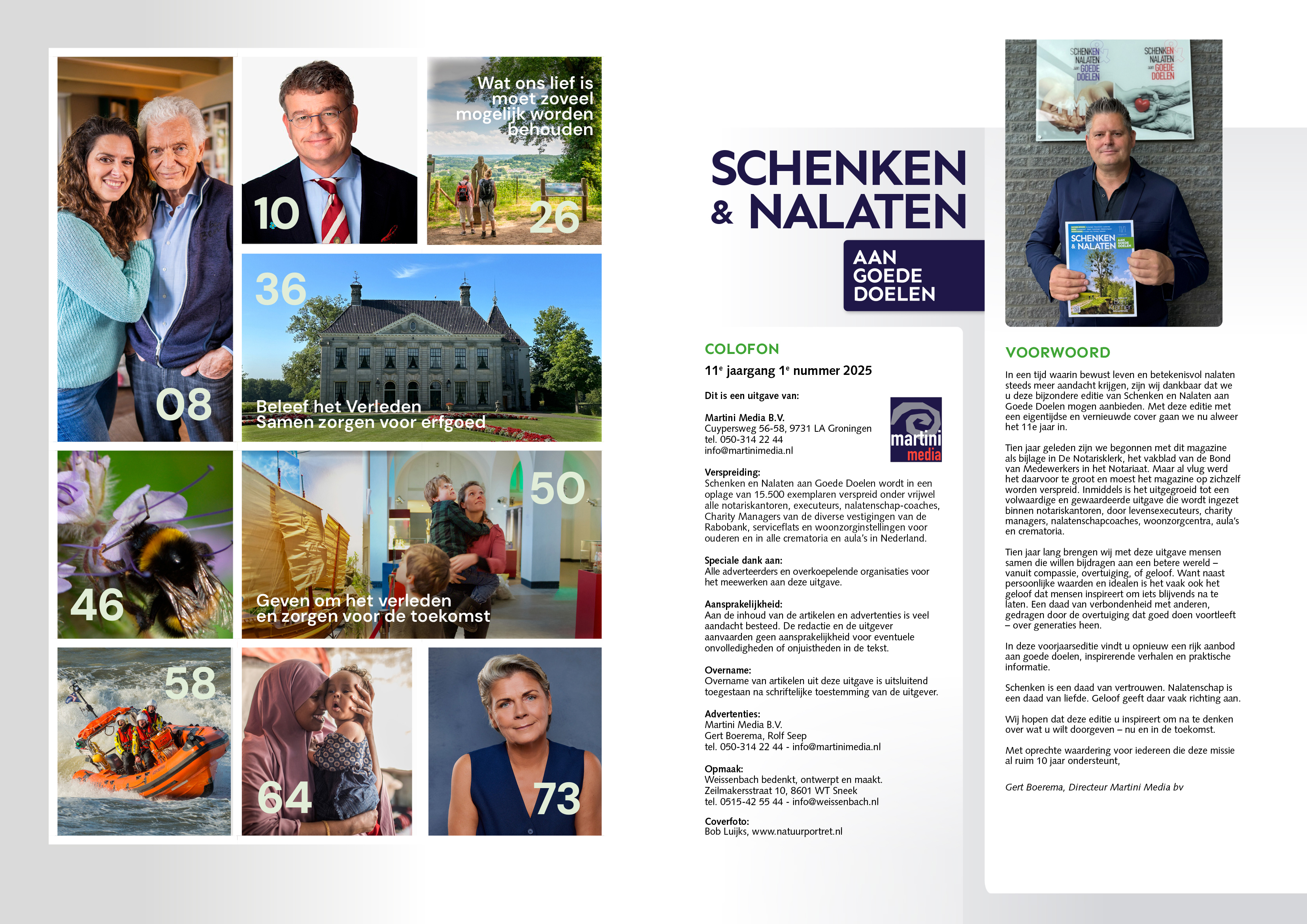 Het glossy magazine Schenken en Nalaten aan Goede Doelen is een informatief magazine over overzicht goede doelen in Nederland. Het verschijnt tweemaal per jaar en wordt in een oplage van 15.500 exemplaren als kosteloos leestafelexemplaar verspreid onder notariskantoren, levensexecuteurs en nalatenschap-coaches en onder serviceflats en woonzorginstellingen voor ouderen in Nederland. Daarnaast wordt het verspreid onder alle aula’s en crematoria in Nederland. Ook de Charity Managers van de diverse vestigingen van de Rabobank ontvangen het magazine voor de major donors.